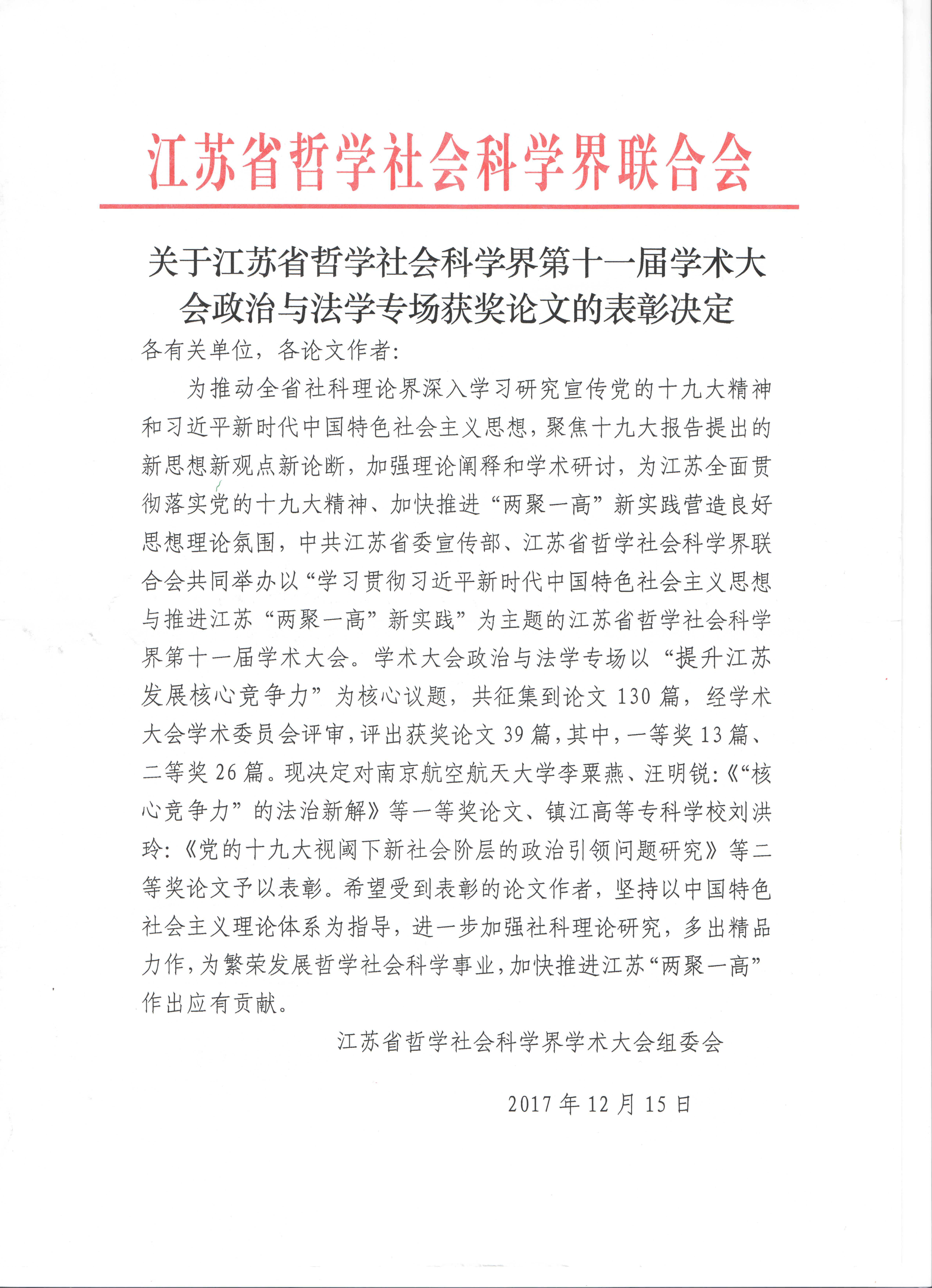 江苏省哲学社会科学界第十一届学术大会政治与法学专场的主题是“提升江苏发展核心竞争力”,来自省内外高校、党校、科研机构和法律实务界的代表100多人参加了政治与法学专场的会议,围绕这一主题展开热烈研讨。本次会议共征集论文130余篇,经学术委员会评审,评出获奖论文39篇,春宫图 李栗燕教授与其研究生汪明锐同学合作的论文《“核心竞争力”的法治新解》荣获江苏省哲学社会科学界第十一届学术大会优秀论文一等奖,李栗燕教授应邀参加会议并在法学专场作了大会发言。