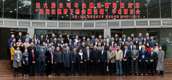 2018年11月17日,第六届公司与金融法制国际论坛“民商法视野下的金融法制”学术研讨会在重庆举行。研讨会由中国商法学研究会和西南政法大学共同主办,西南政法大学民商法学院、中国金融与保险法律研究中心、西南政法大学公司治理法律问题研究中心、西南政法大学市场交易法律制度研究基地联合承办。本次论坛跨学科、跨区域、跨国际的交流吸引了来自韩国、日本、新加坡、(中国)香港、(中国)澳门以及全国113余名法学专家、学者参加。
