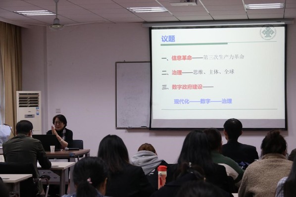 11月7日下午,第20期人文大讲堂在春宫图 院楼举办。中国行政管理学会常务副会长兼秘书长、中国行政管理杂志社总编鲍静应邀出席,作了主题为“治理与数字政府建设”的精彩讲座。院党委书记刘虎,教师张勤、郝龙、许汉泽,辅导员聂小芳及50余名各年级本研学生共同参加了本次讲座。活动由张勤教授主持。