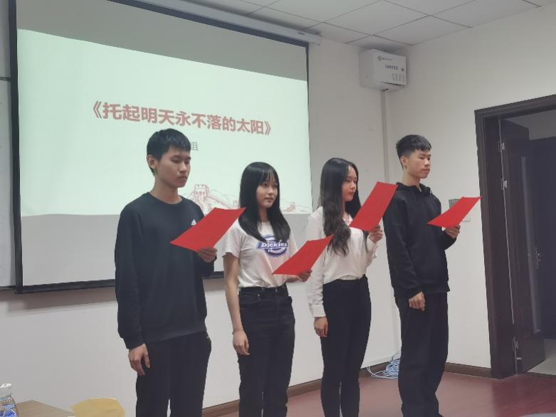 无疑,祖国的今天,是无数革命先烈以血肉之躯建筑而成的宏伟大业,抗日战争的不朽之魂为我们书写了祖国新的篇章。活动第三部分,大三行政班与大一的同学们共同带来了诗歌朗诵——《托起明天的太阳》,具体讲述了中国共产党带领全国人民浴血奋战的历史,真切地表达了人民对党的敬爱,尽情地歌颂了“祖国啊,我的父母之邦。”