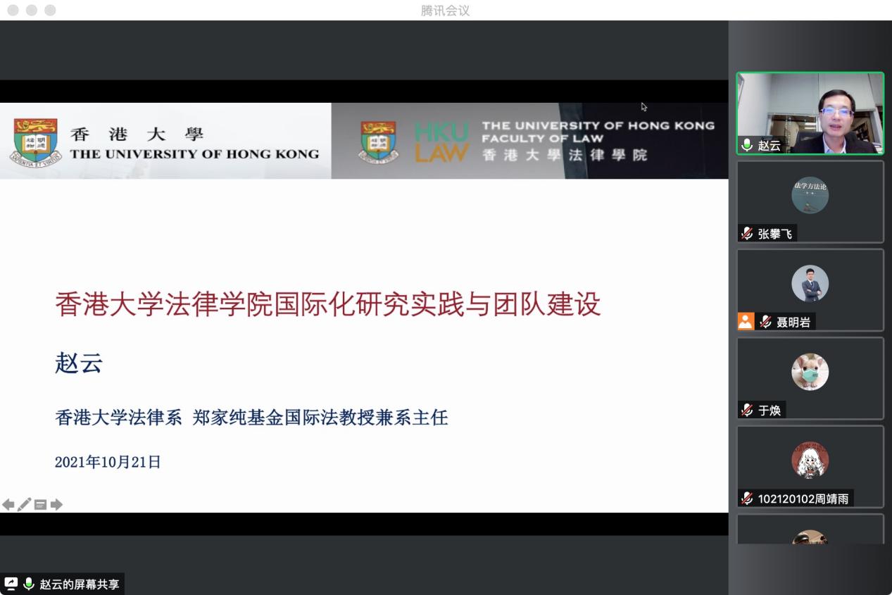 10月21日晚,香港大学法律学院法律系主任、博士生导师赵云教授通过腾讯会议在线为大家作了题为“香港大学法学院国际化研究实践与团队建设”的讲座。讲座由法律系聂明岩副教授主持,法律系教师于焕博士、各年级本科生、硕士生参加了讲座。