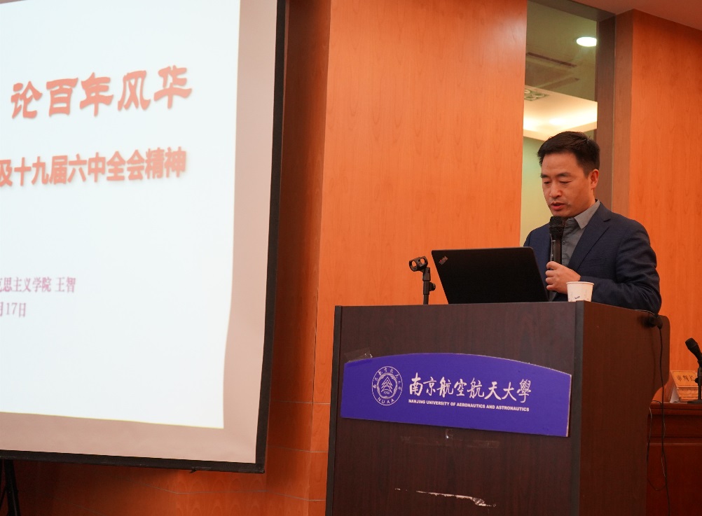 王智教授以“探精神之源 论百年风华”为主题,从历史选择、百年风华、精神赓续、以史为鉴四个方面为切入点,为学院师生详细解读了习近平总书记“七一”重要讲话及十九届六中全会精神。他深入浅出、图文并茂的阐述了中国共产党是如何领导中国人民开辟伟大社会革命新道路的,中国百年革命话语经历了怎样复杂的过程。他提出,我们要深刻认识中国共产党百年大文章的“中心思想”和“段落大意”,准确把握中国共产党百年奋斗的历史意义,总结党领导人民进行伟大奋斗的历史经验,勿忘昨天的苦难辉煌,无愧今天的使命担当,不负明天的伟大梦想,在新的征程上更加坚定、更加自觉地牢记初心使命、开创美好未来。
