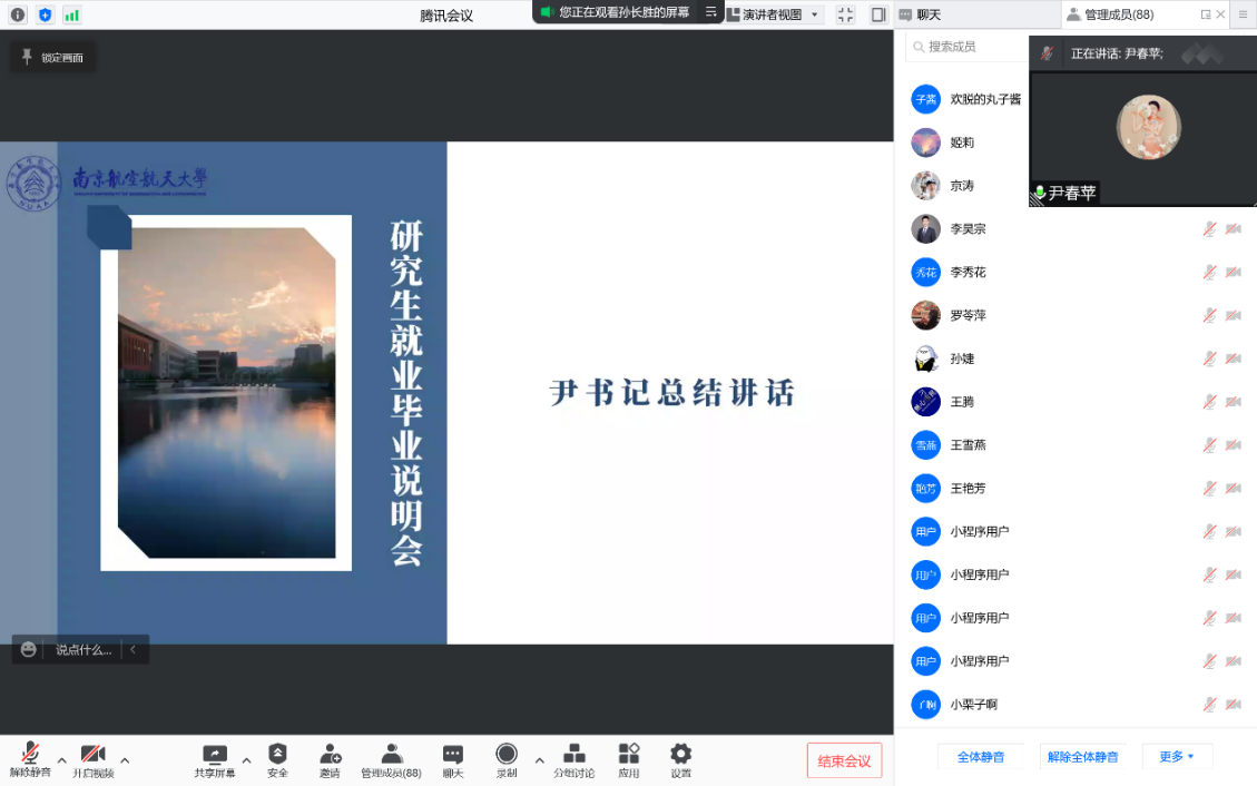 尹春苹在总结发言中强调,找工作是一个选择的过程,同学们要以积极的心态把握就业动态,也要保持平和的心态理性择业。希望同学们能充分利用在校时光,拓宽人生的阳光大道,永葆自律的精神品质,为自己的南航人文研途生涯画上圆满的句号。