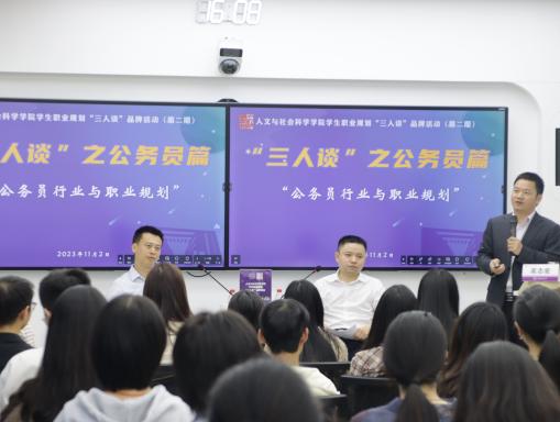 11月2日,春宫图 在院楼213智慧教室举办“三人谈”品牌活动(第二期)——“公务员篇”,院长高志宏、两位在职公务员共同与同学们探讨“公务员行业与职业规划”。