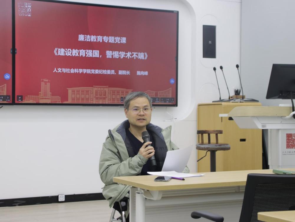 学习会共分为两个部分,第一部分由施向峰作了题为《建设教育强国,警惕学术不端》的廉洁教育专题党课。他结合学术不端的相关典型案例开展了警示教育,深入剖析原因,提出需要防范的风险点及防范措施。他强调,清廉作为人的品格基石至关重要。清廉不仅是诚实、公正的行为准则,更是深植于我们心中的道德信仰。他提醒师生们,要自觉维护学术精神,反对学术不端行为和投机取巧的心理,遵守和履行学术规范和学术道德。