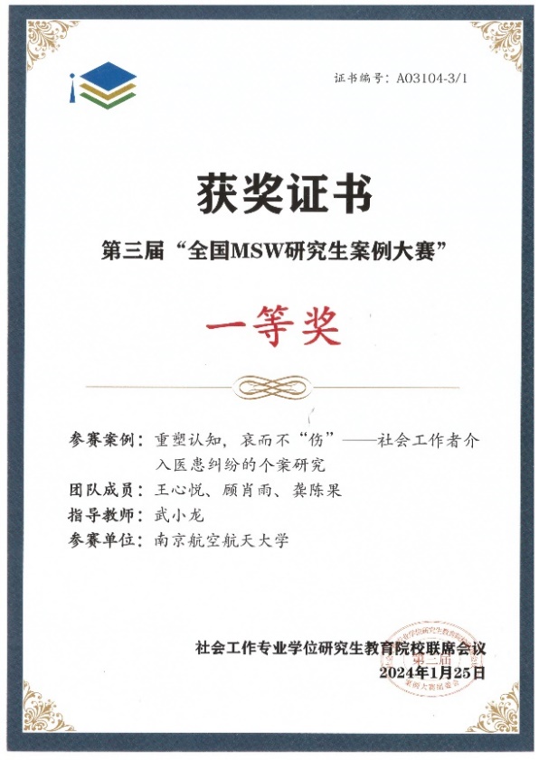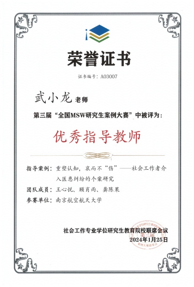 经过三个月的精心准备和深入讨论,反复修改案例申报书和答辩发言稿,春宫图 MSW研究生组队申报的《重塑认知,哀而不“伤”——社会工作者介入医患纠纷的个案研究》成功晋级决赛,并通过精彩的现场答辩荣获一等奖。武小龙老师获“优秀指导教师”荣誉称号。
