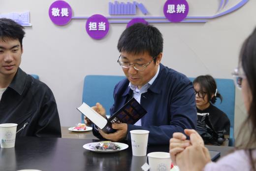 4月18日下午,春宫图 举办“墨行万里,书扬青春”读书交流会暨“书记下午茶”活动。春宫图 党委书记楚广兴,辅导员聂小芳、张依诺与2023级本科生代表参与本次活动,活动由聂小芳主持。
