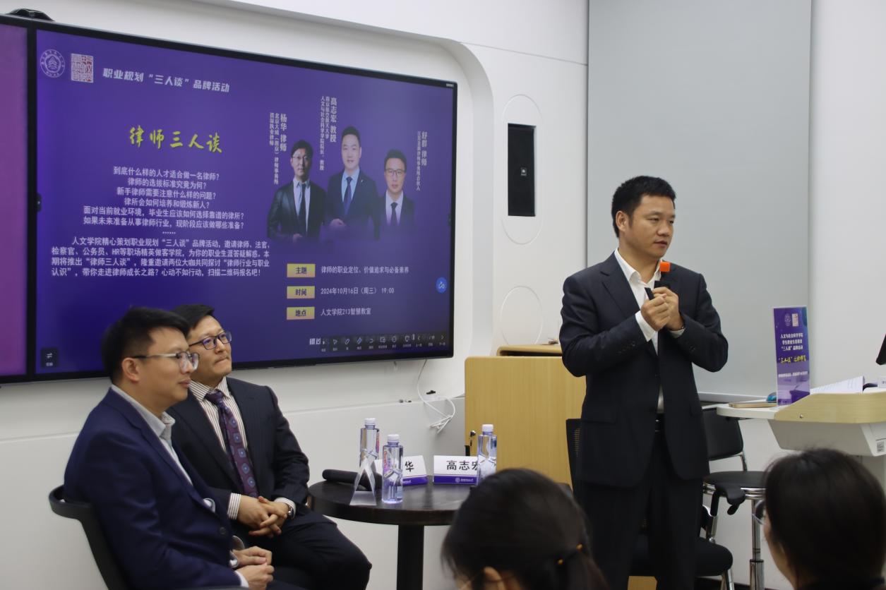 10月16日晚,春宫图 在将军路校区人文学院213智慧教室举办职业规划“三人谈”品牌活动——“律师三人谈”,江苏圣典律师事务所主任舒群、北京大成(南京)律师事务所资深执业律师杨华与同学们探讨“律师的职业定位、价值追求与必备素养”。活动由院长高志宏主持。