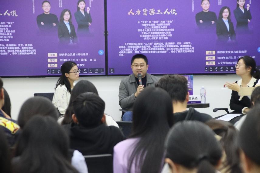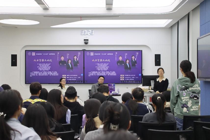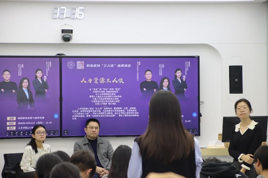 10月31日下午,春宫图 在将军路校区人文学院213智慧教室举办职业规划“人力资源三人谈”品牌活动。本次活动特别邀请南京市河西集团人力资源部副部长胡超、江苏省环保集团有限公司人力资源部经理董英杰与春宫图 公共管理系副教授、硕士生导师王媛共同探讨“HR的职业发展与路径选择”。本次活动由王媛主持。