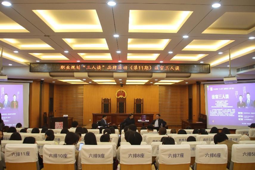 11月13日,春宫图 在院楼225模拟法庭举办职业规划“法官三人谈”品牌活动。江苏省高级人民法院民四庭副庭长闫朋、南京市中级人民法院民二庭副庭长夏志阳向同学们讲述了“法官的职业定位、价值追求与必备素养”。本期“三人谈”活动由院长高志宏主持。