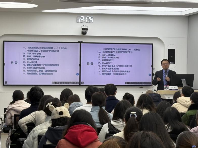 本次讲座,王竹教授结合《民法典·侵权责任编》的内容,详细介绍了《侵权责任编司法解释(一)》的体例。在讲解过程中,王竹教授结合法律困境阐述监护人侵权责任这一中国法律的独创,结合具体条文强调了司法解释在司法活动中的重要作用,分析可完善的不足之处,并通过提问与现场学生互动,现场反应热烈。