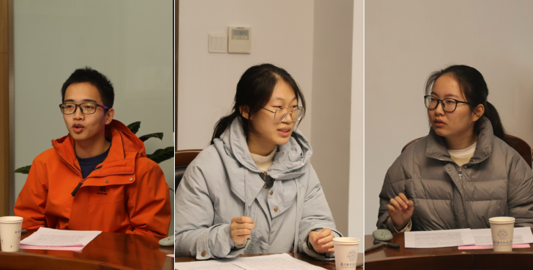 院团委副书记赵辰从班级整体概况、学习科创成果以及期末备考情况三个方面介绍了班级情况;心理气象员谢楚楚结合自身学习成长,介绍了班级同学的思想动态以及各项素质能力锻炼情况;学习委员马雨田领学了《大国智库》一书,启迪同学们思考如何在日新月异的时代,更好地走向未来。