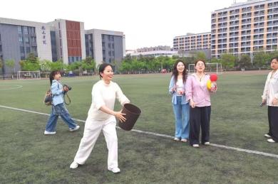 第一项“巧运乒乓·指尖博弈”,师生默契小球接力;第二项“四人五足·同心同行”,大家肩抵肩、手挽手,化身“连体战士”;第三项“趣味前进·环环相扣”,在欢呼声中极速前行;第四项“你投我接·信任之约”,老师们化身“神投手”,同学们稳持球桶严阵以待;第五项“盲人方阵·穿越障碍”,师生以信任为盾,突破重重关卡。
