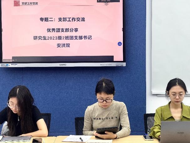 在支部工作交流环节中,本科生团支书代表叶子田田介绍了支部开展一支部一项目“法与童行”的创新实践和丰硕成果,为其他支部提供了可借鉴的经验与思路。研究生团支书代表安洪双以“勇担青春使命,建造活力支部”为题,分享了支部开展理论学习的经验。