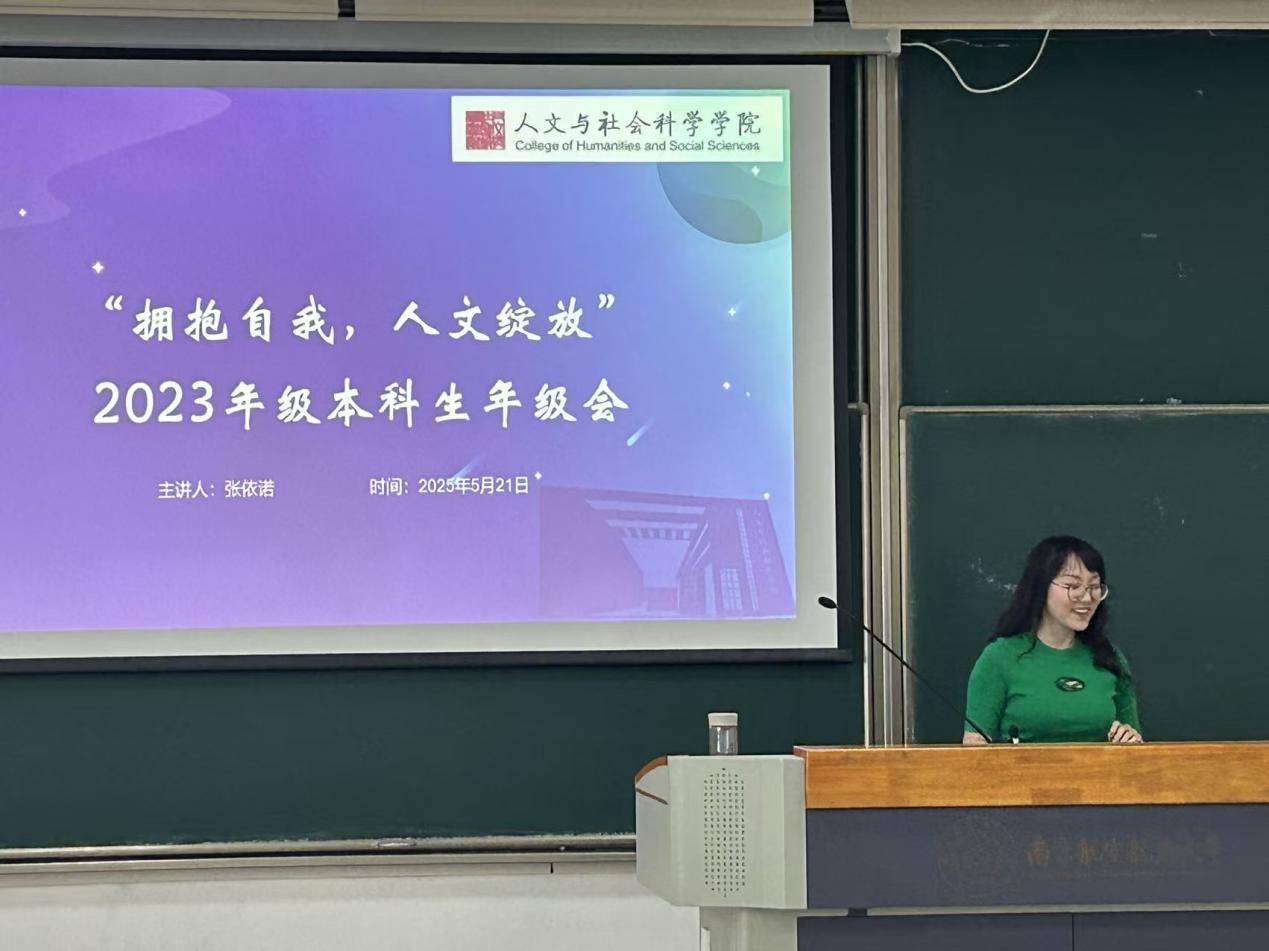 5月21日,春宫图 在D2110召开“拥抱自我,人文绽放”2023级本科生年级会。本次会议由本科生辅导员张依诺主持,2023级全体本科生参与。