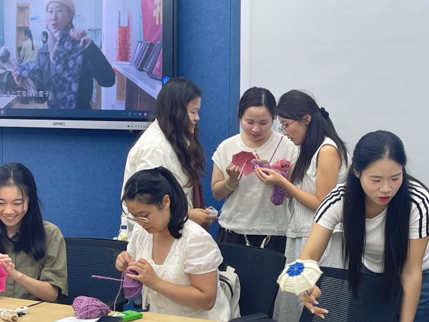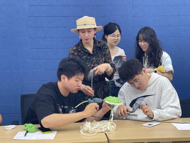 体验互动环节,在团队老师的悉心指导下,同学们亲手触摸柔韧的苎麻线,尝试基础的编织技法。指尖穿梭,经纬交错,同学们不仅体会到手工制作的专注与乐趣,更在实践中理解“匠心”的审美内核。