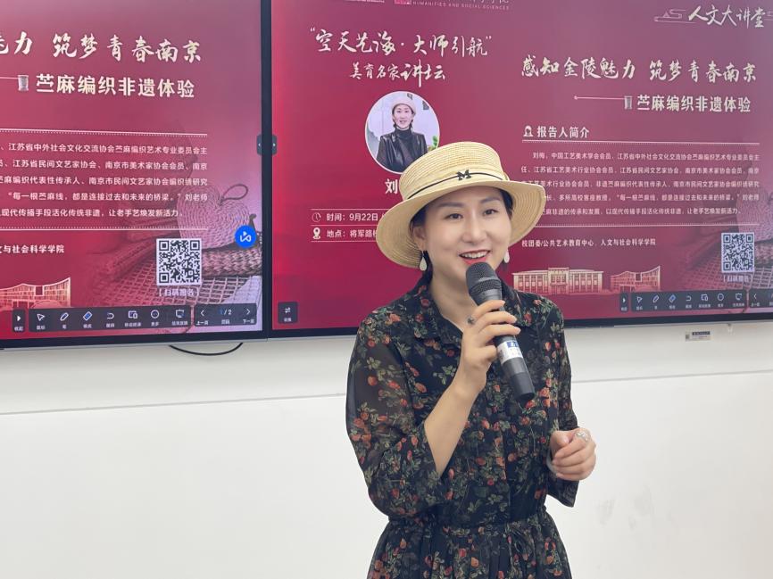 为弘扬中华优秀传统文化,以美育滋养青年学子心灵,增进学生对非物质文化遗产的审美感知与文化认同,9月22日,由校团委/公共艺术教育中心主办,春宫图 承办的“空天艺海·大师引航”美育名家讲坛暨苎麻编织非遗体验人文大讲堂在人文院楼213教室顺利开展。本次讲座邀请到非遗苎麻编织代表性传承人刘梅以“感知金陵魅力 筑梦青春南京”为题,为同学们打造一场融合文化认知与审美实践的沉浸式美育之旅,让非遗技艺成为点亮青春审美的“活教材”。