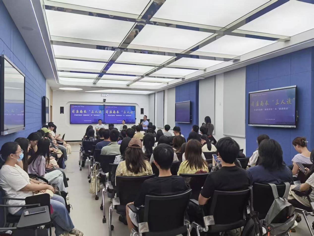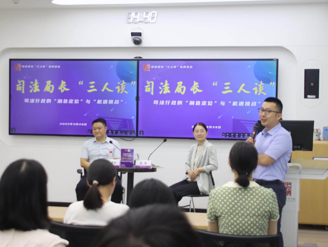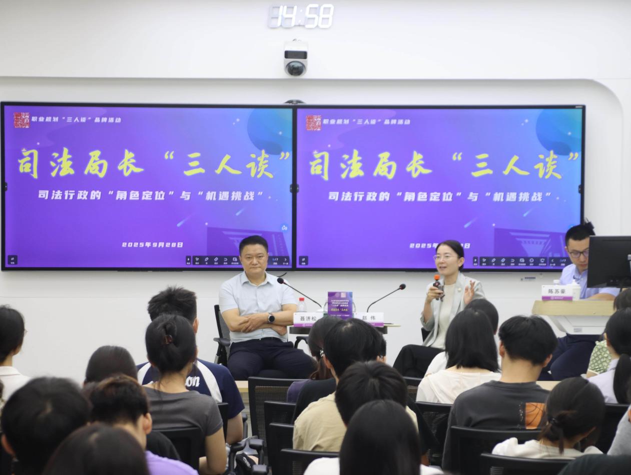 在院楼213智慧教室开展职业规划“三人谈”品牌活动。南京市浦口区司法局党组书记聂济松、江宁区司法局副局长赵伟受邀到场,结合一线工作经验解读司法行政的“角色定位”与“机遇挑战”,并与同学们进行互动交流。活动由法律系副主任陈苏豪主持。