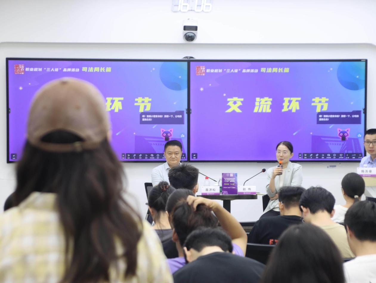 随后,陈苏豪紧扣学子关切,与两位嘉宾围绕“职业认知、能力要求、成长路径、适配建议”四大核心维度展开深度对话。谈及“能力要求”时,聂济松强调:“司法行政工作既要有‘懂法律’的专业硬实力,也要有‘会沟通’的群众工作软实力,比如在社区普法时,能把法条转化为老百姓听得懂的家常话,才是真本事”。赵伟则结合自身从基层岗位到管理岗位的成长经历,分享“阶梯式发展”经验:“刚入职时多参与一线办案、调解,积累实务经验;中期可聚焦专项领域深耕,比如行政复议、法治政府建设;长期要培养全局思维,学会从‘执行者’向‘谋划者’转变”。两位嘉宾的解读深入浅出,为同学们勾勒出了清晰的职业成长图谱。