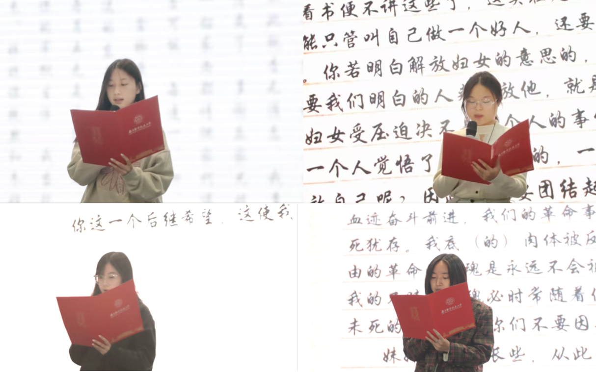“我牺牲了我的一切,为的是我们民族的生存和解放……”“别了,我爱的人,我愿化作泥土,留在你必经的路上……”在学员诵读环节,学生代表们饱含深情地朗读雨花英烈家书原文。激昂的语调、真挚的情感,仿佛跨越时空的桥梁,将在场师生与革命先辈紧密相连。人文学院2024级学生王端端表示:“以前总觉得英烈的故事离我们很远,但今天通过家书,我仿佛能直接感受到他们的牵挂与信仰,这种精神力量让我深受震撼,也让我更加明白当代青年的责任与使命。”