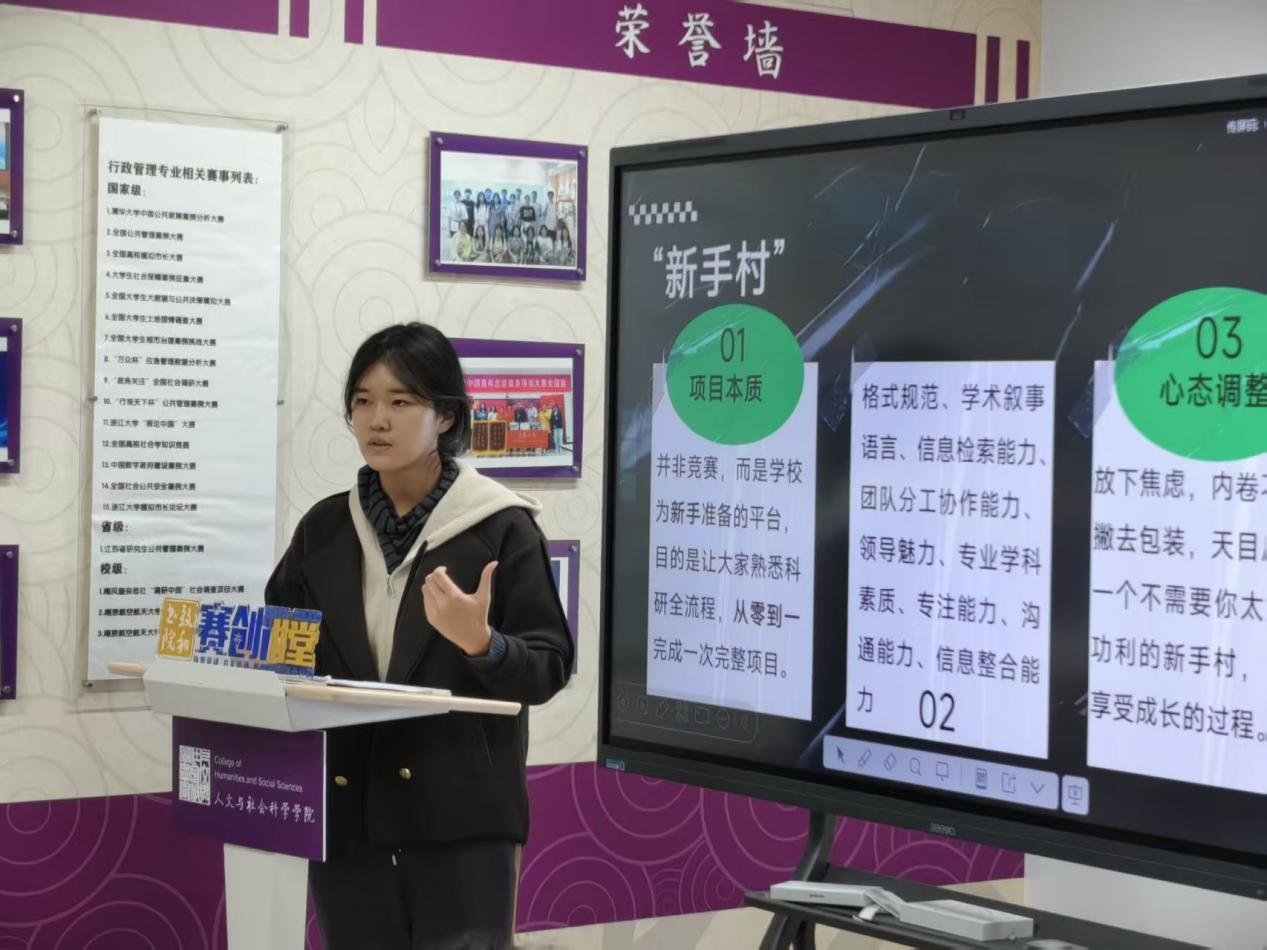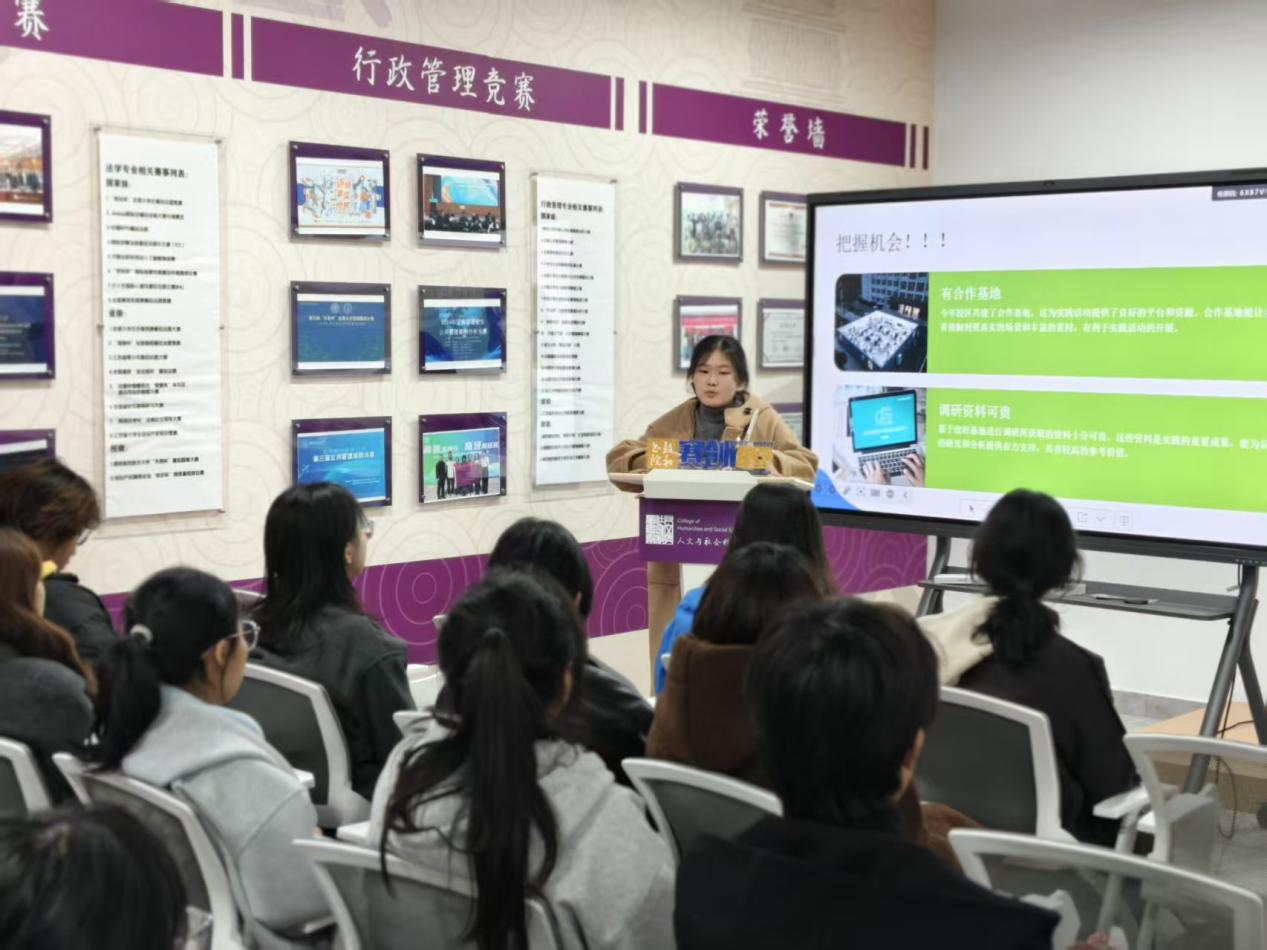 12月3日,公管系孙秋芬、林思屹两位老师以“以创新实践叩响未来之门”为主题,聚焦校社协同与竞赛能力培养,与大一同学们展开交流。孙秋芬老师重点阐释了“校社协同育人”的丰富内涵,并结合学院与溧阳数据局、应急管理局的校社协同项目,说明其如何连接理论与现实、助力学生在基层实践中锤炼担当;林思屹老师紧扣低空经济与智慧城市治理浪潮,强调选题需兼顾创新性、可行性与公共价值,解读新兴岗位能力需求,推荐学习SPSS、Python等实用工具,鼓励主动承担关键角色提升沟通能力。两位老师的分享精准对接学生需求,为科创实践与未来发展搭建起桥梁。