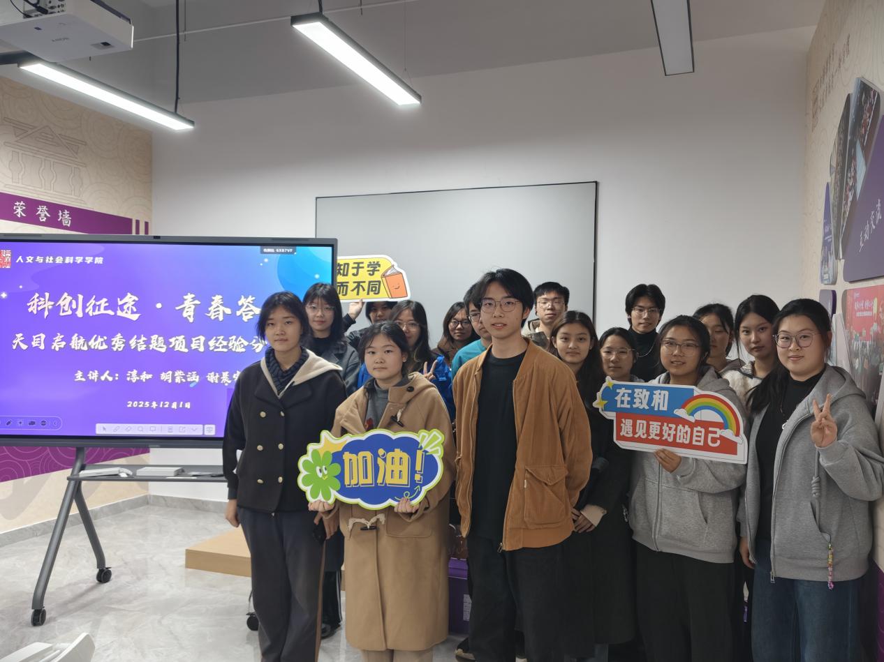 12月1日,“科创征途·青春答卷”天目启航优秀结题项目经验分享会如期举行。淳和、胡紫涵、谢晨睿三位优秀学生代表化身“科创引路人”,倾囊相授实战经验。淳和从流程把控入手,强调时间规划、主动沟通与团队协作的重要性,分享文献检索实用技巧;胡紫涵结合调研实践,提醒同学们重视前期积累与兴趣挖掘,鼓励深耕成果转化;谢晨睿从研究起点到结题答辩,剖析竞赛所需综合素养,寄语新生尽快熟练使用社科话语体系。现场氛围热烈,大一学子专注聆听,提问环节围绕时间管理、任务分配等困惑积极互动。