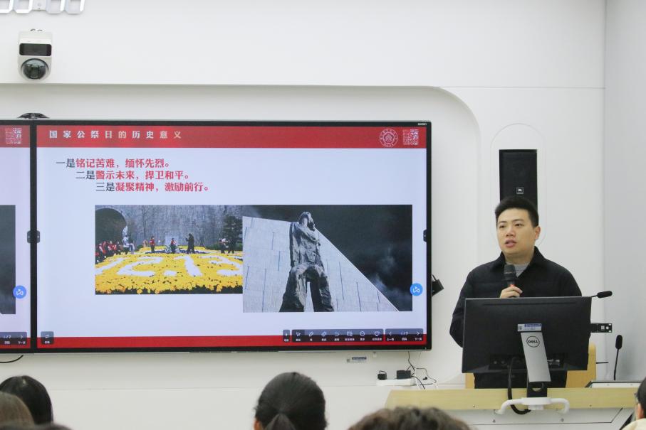 学院法律系教师李烨带来《国家公祭日:历史事实与青年使命》主题思政课。他从日军侵华的历史背景切入,通过具体史实还原了南京大屠杀中遇难同胞的悲惨遭遇,讲述了那段山河破碎、生灵涂炭的黑暗岁月,让在场同学们深刻体会到战争的残酷与和平的珍贵。他表示,中华民族在历经战乱与深重苦难中展现出的顽强抗争、永不言弃的精神,这种精神值得每一位青年学子传承。
