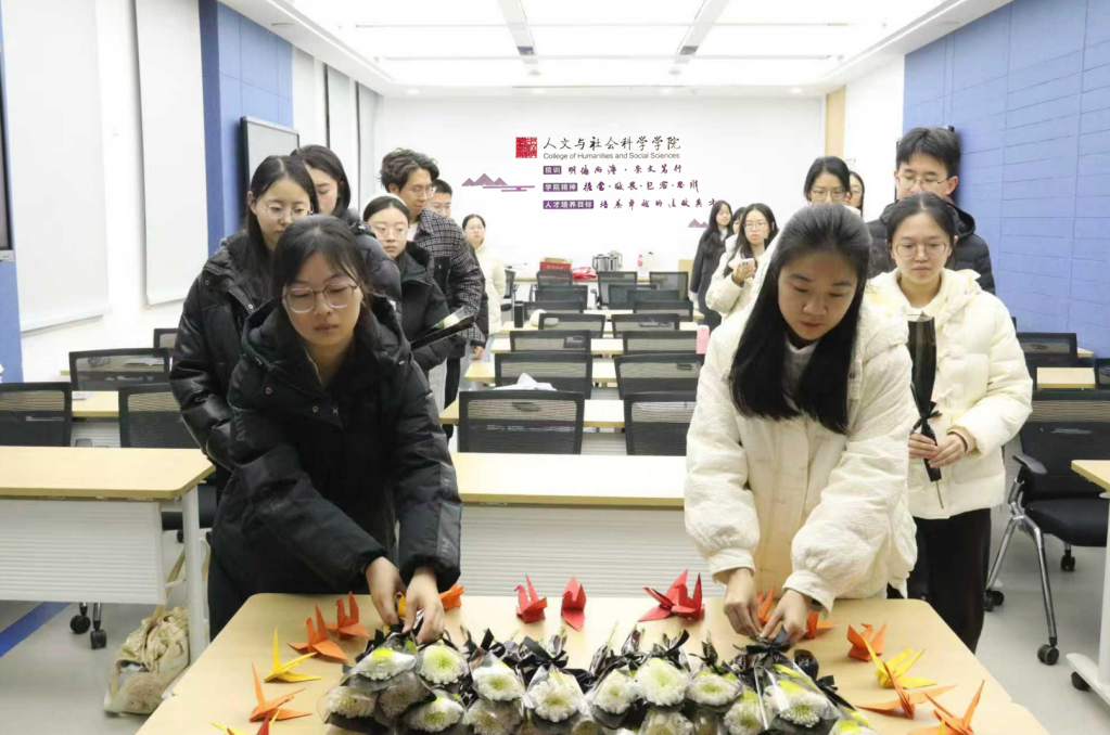 随后,两校区同学们观看了南京大屠杀死难者国家公祭仪式直播。现场师生怀着无比沉重的心情,肃立默哀,共同缅怀在南京大屠杀中遇难的30万同胞。当警报声响起,全场一片肃穆,师生们低头垂目,以默哀的方式表达对逝者的追思与哀悼。直播画面中,历史的沉重与现实的和平形成鲜明对比,深深触动了在场的每一个人。随后,同学们整齐列队,依次上前献上精心准备的菊花与自制千纸鹤,每一枝鲜花、每一只纸鹤都寄托着同学们“铭记真相、珍爱和平”的厚重承诺。